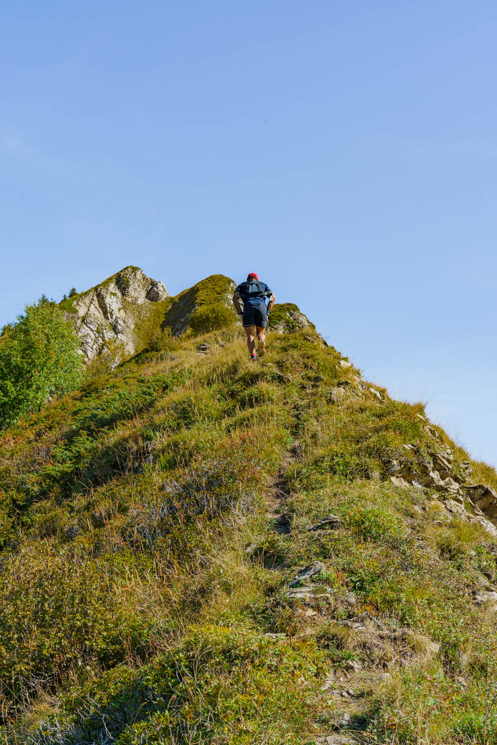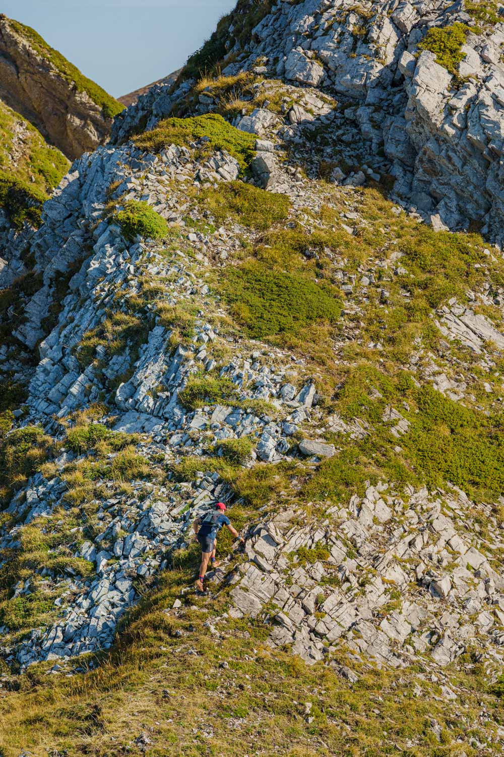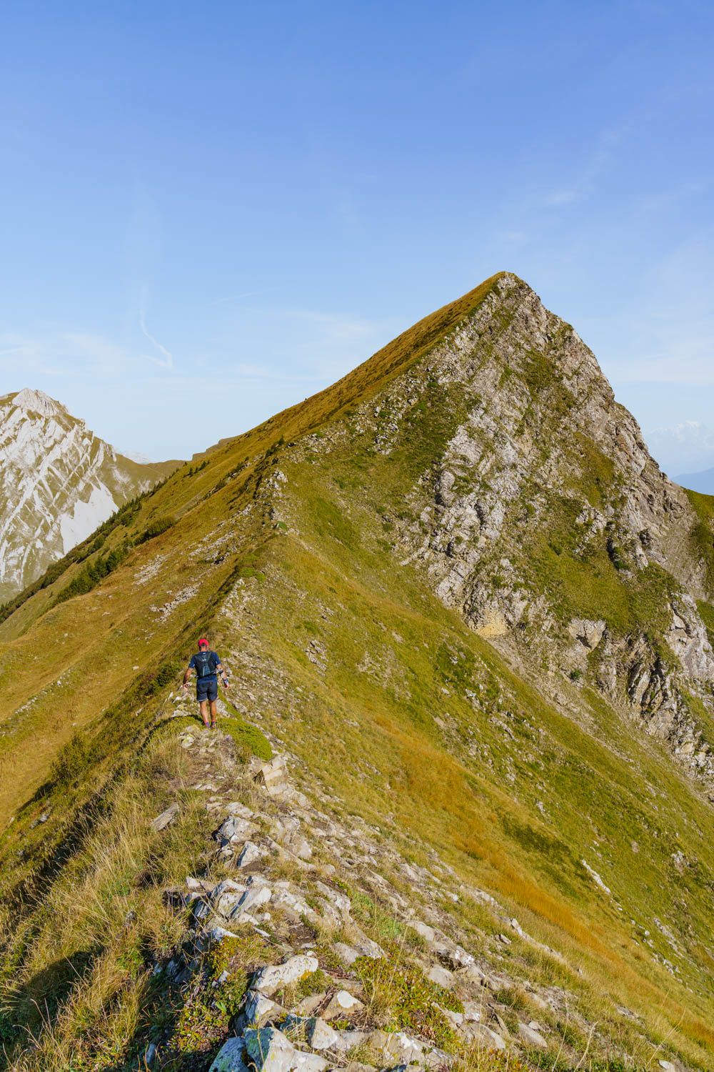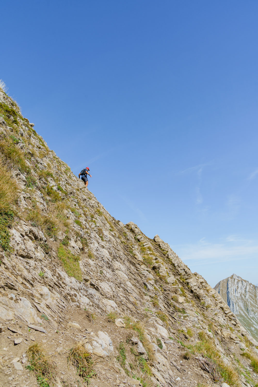 Il faut d’abord descendre sur un terrain caillouteux et instable entre la roche friable et la terre sèche et glissante. Il faut rester attentif et prêt à réagir si un rocher se détache. Après une longue première traversée alternant montées et descentes sur l’arête, on atteint finalement la Pointe des Arlicots.