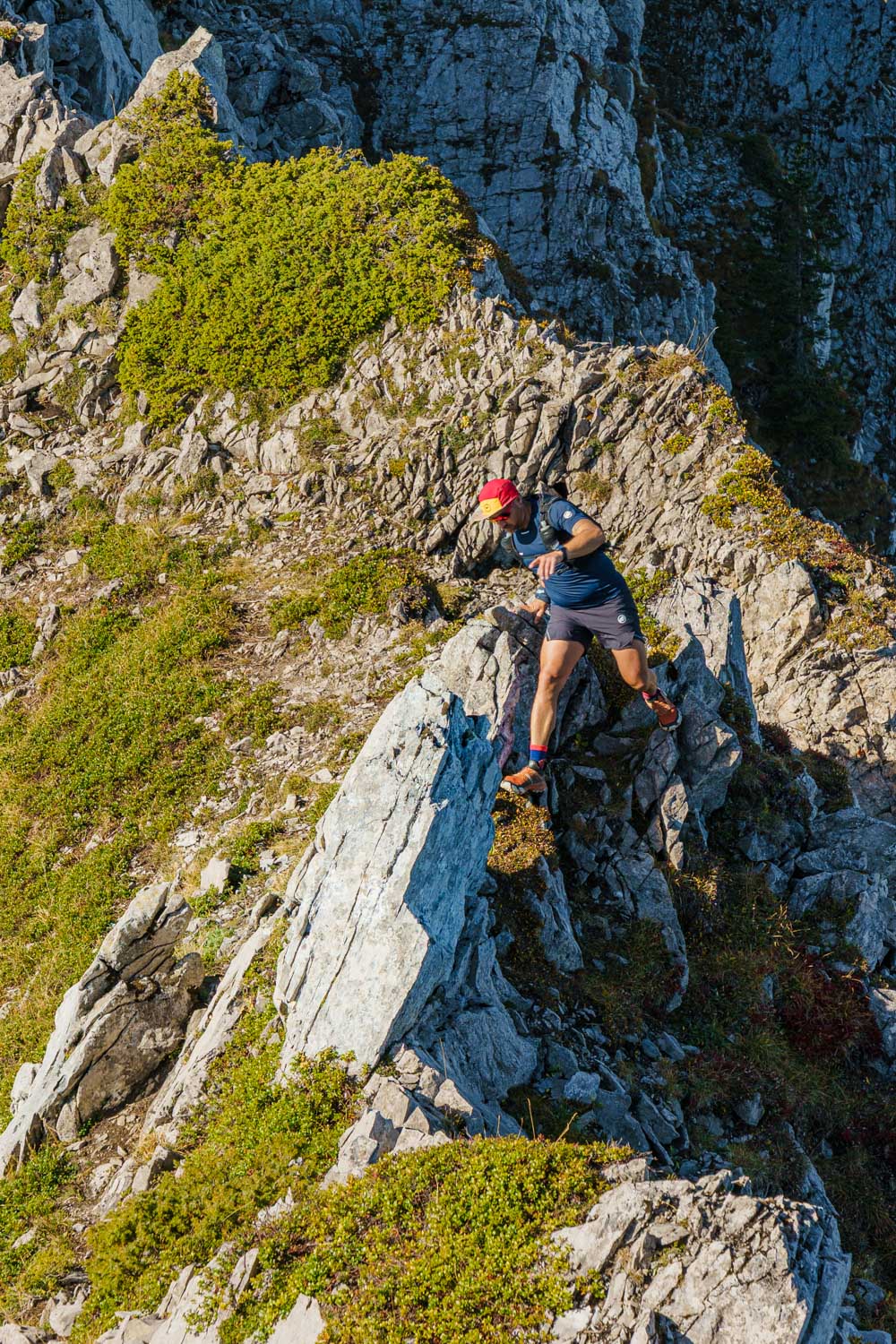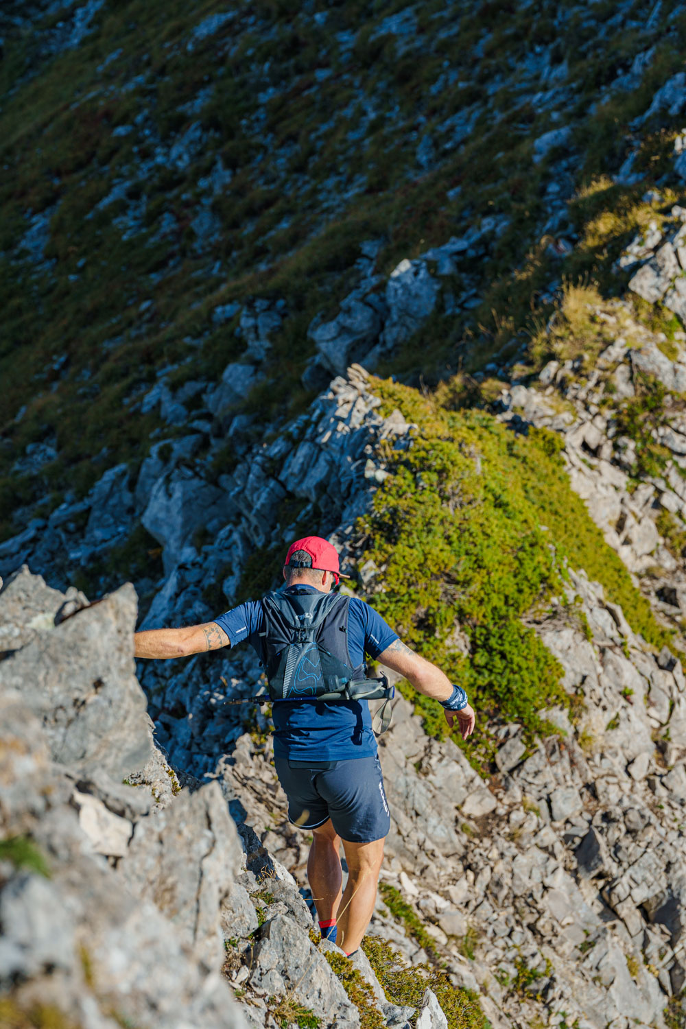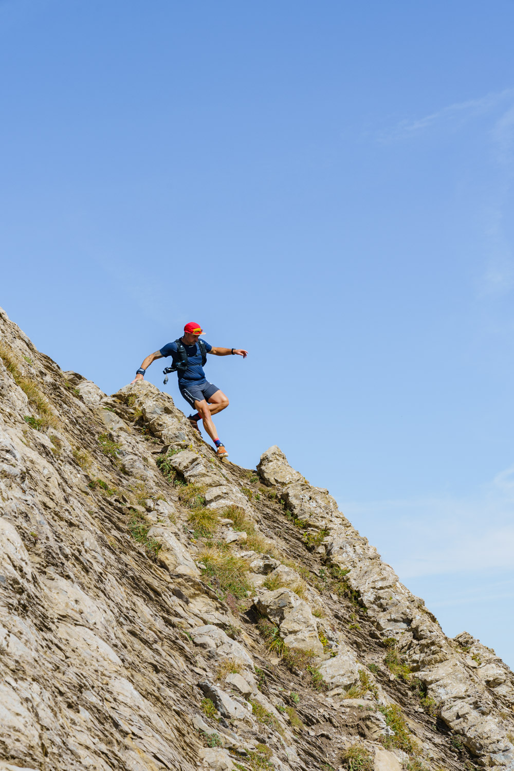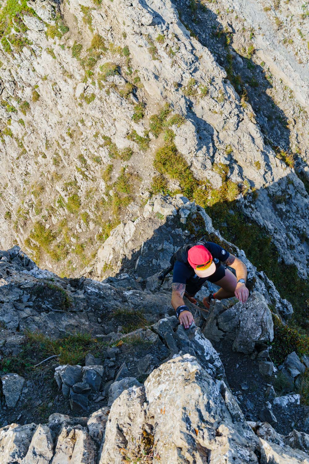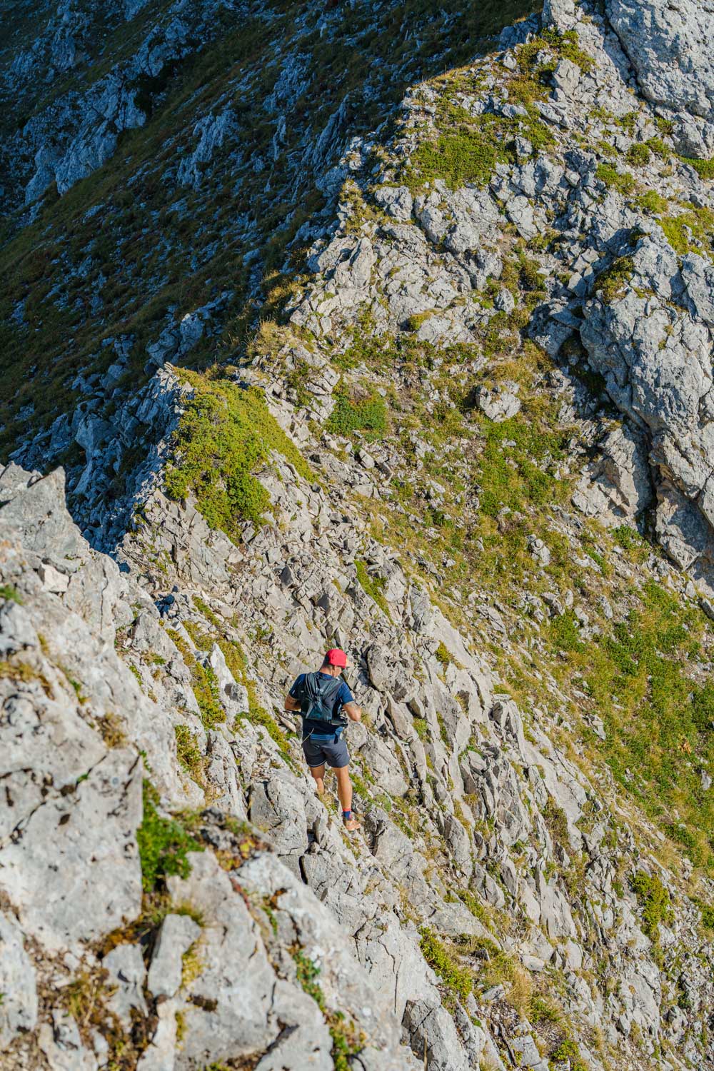 Il faut d’abord descendre sur un terrain caillouteux et instable entre la roche friable et la terre sèche et glissante. Il faut rester attentif et prêt à réagir si un rocher se détache. Après une longue première traversée alternant montées et descentes sur l’arête, on atteint finalement la Pointe des Arlicots.