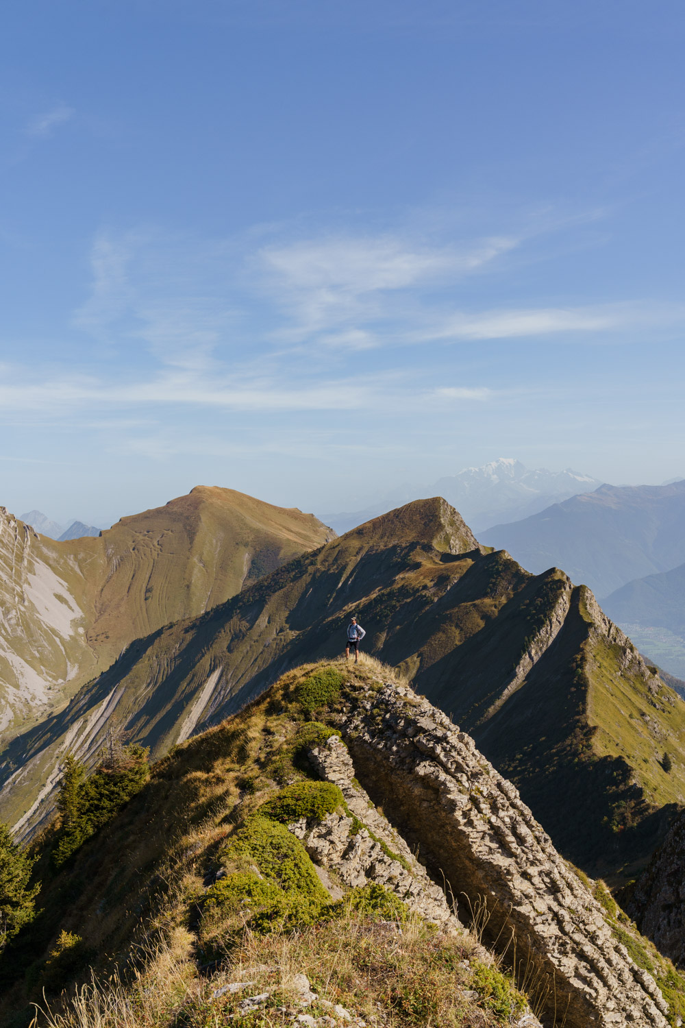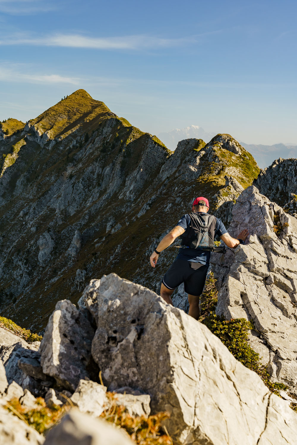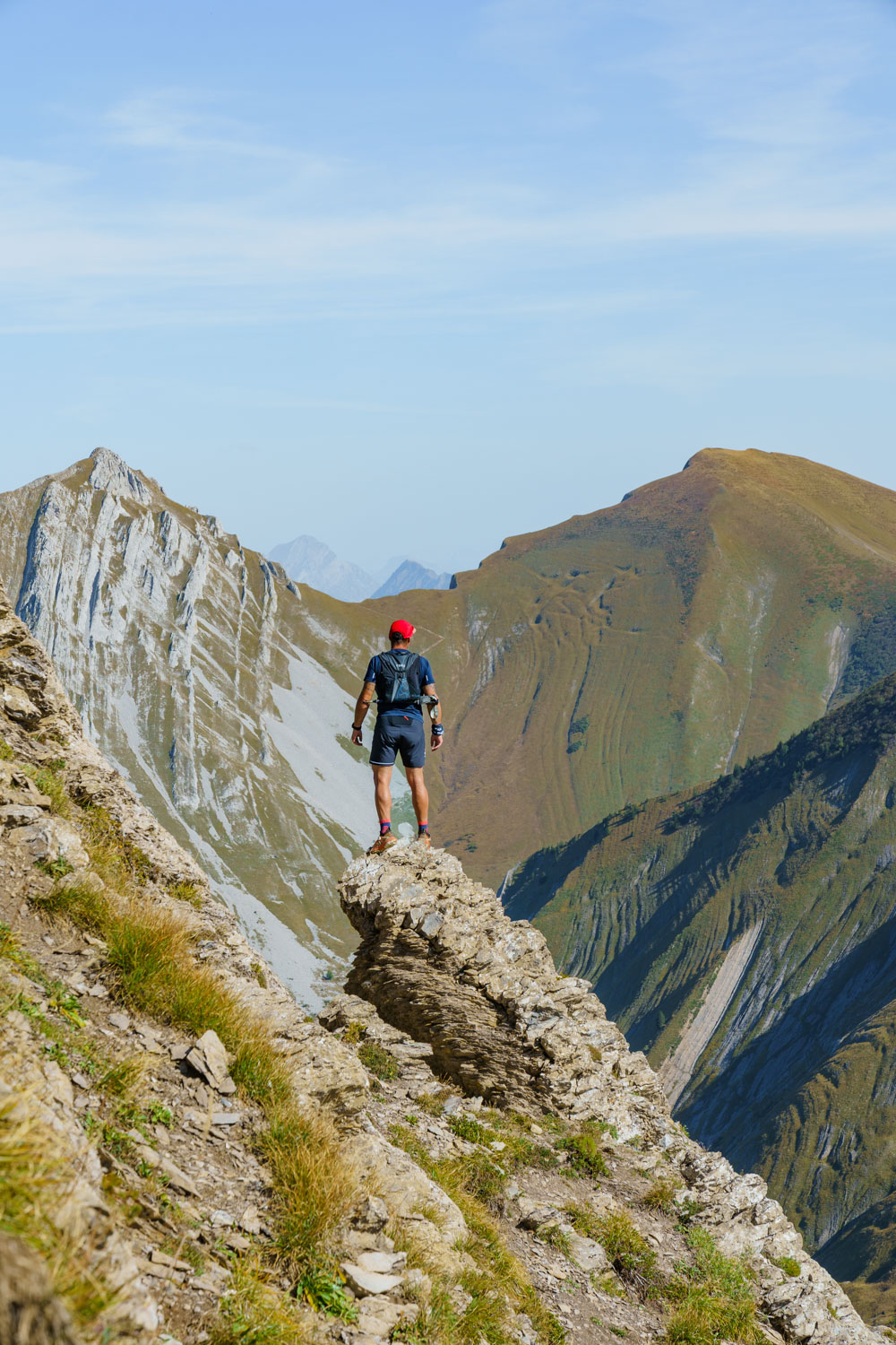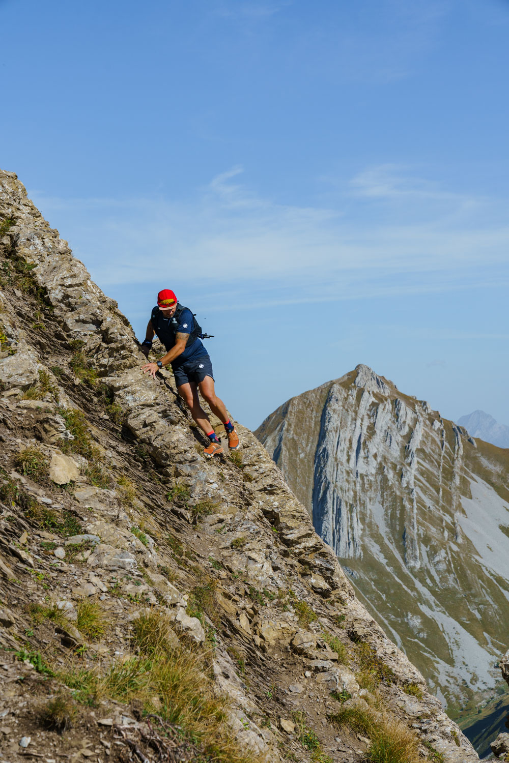 Une fois cette section passée, on progresse plus aisément sur une arête qui se transforme progressivement en crête, avec des sections toujours exposées. Les jambes commencent à peser lourd, et il reste une grosse montée pour atteindre le dernier sommet de la journée, la Pointe des Arces. Finalement atteinte, il est temps de prendre une pose méritée et d’avaler quelque chose pour reprendre des forces ! Il ne faut pas l’oublié, il faut maintenant descendre tout le dénivelé grimpé pour rejoindre la voiture !