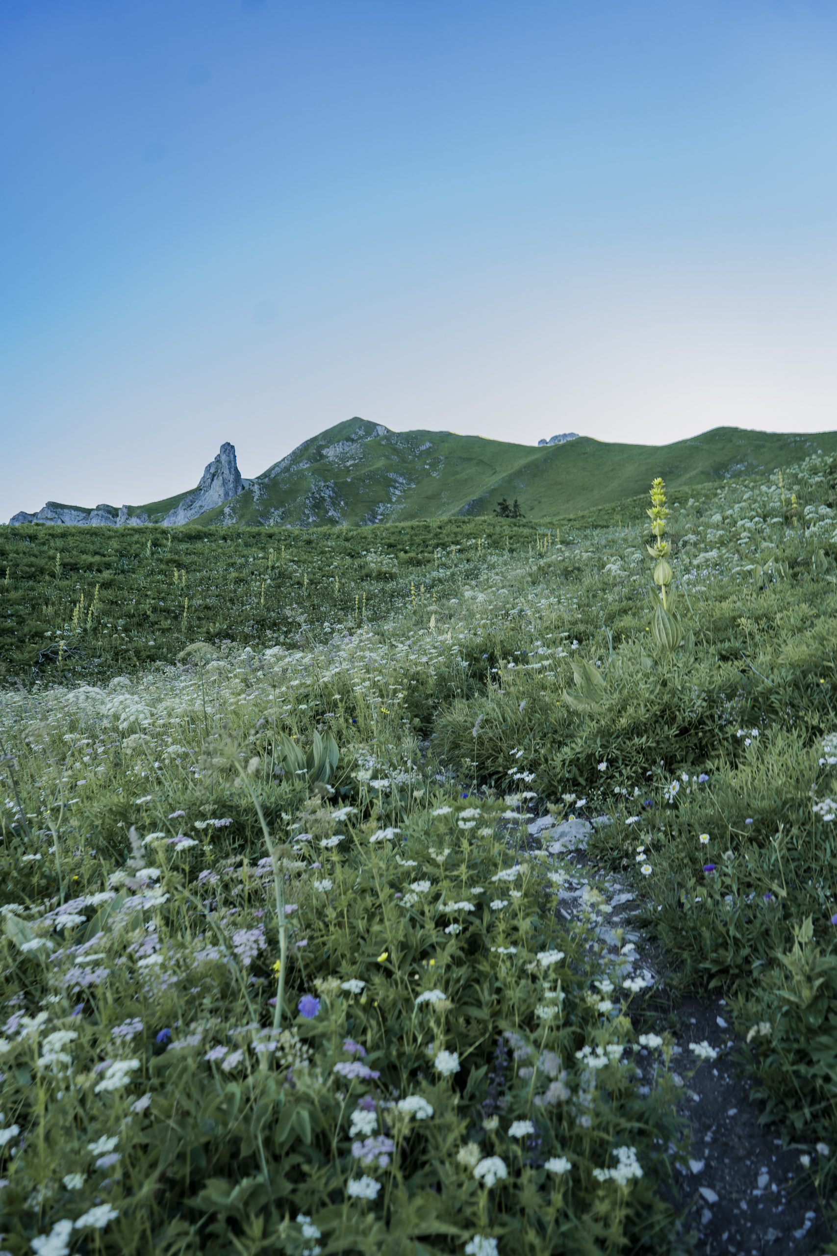 La traversée d’un cours d’eau, ou d’une cascade selon la saison, peut nécessiter de se mouiller, ajoutant une touche d’aventure. Le sentier émerge dans un pré aux herbes hautes, où la Dent de Pluven se dresse non loin. Bien que non marqué sur les cartes, un semblant de sentier se fraye un chemin en sa direction.