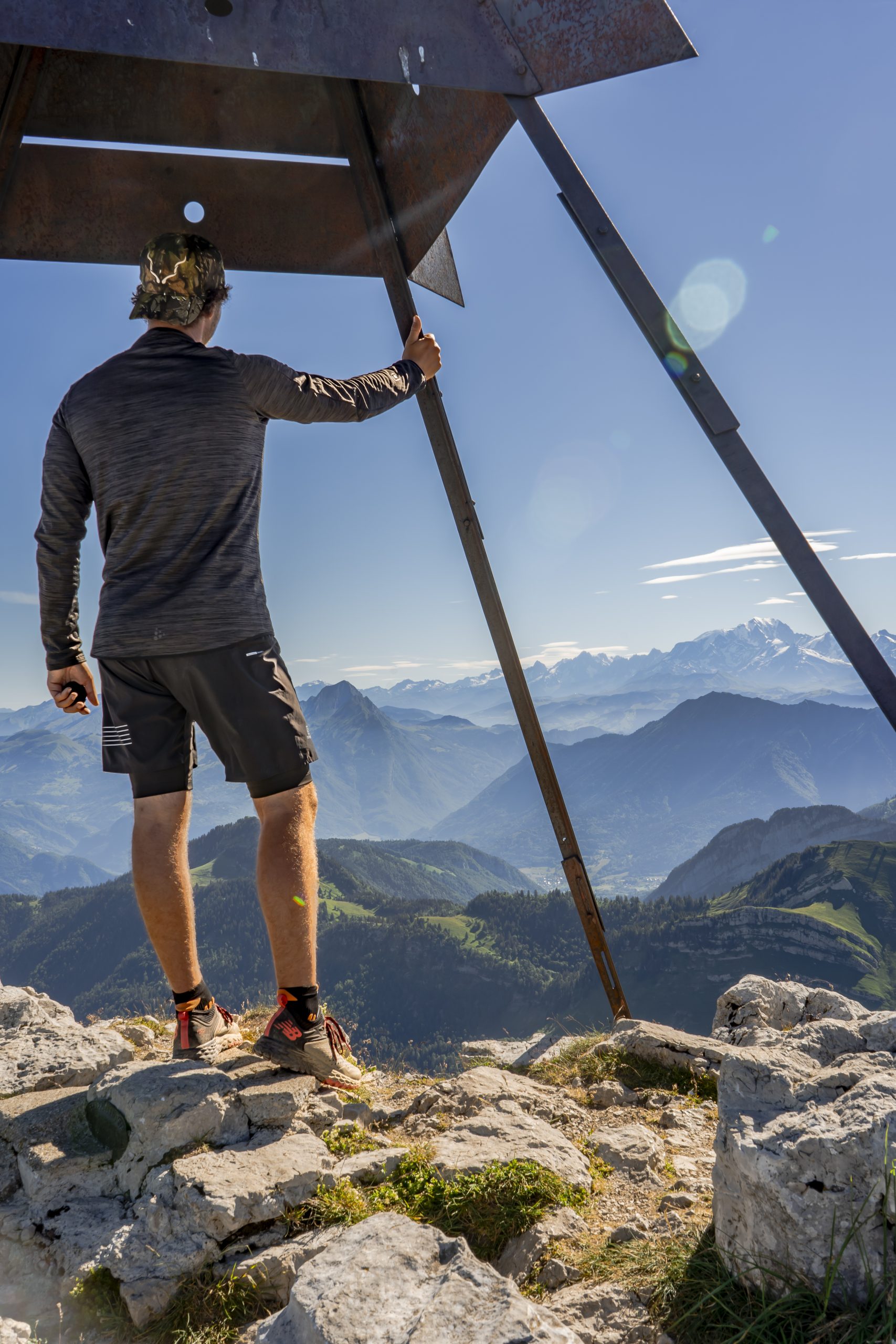 La dernière ascension vers le Trélod devient plus technique, nécessitant l’usage des mains, mais reste sécurisée. Au sommet, une croix et un paratonnerre marquent le point culminant, offrant une vue à 360 degrés avec le Mont Blanc en arrière-plan.
